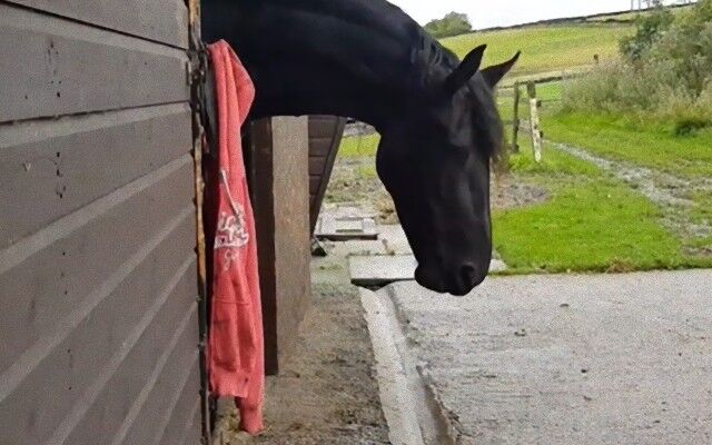 Phoenix the friesian tosses her owners coat on the floor thenhides the evidence!