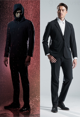 シックで整った見た目とは裏腹に、コート顔負けの撥水・速乾機能のほか、どんな動きでも体にフィットする伸縮機能を兼ね備えた全く新しいスーツです!
