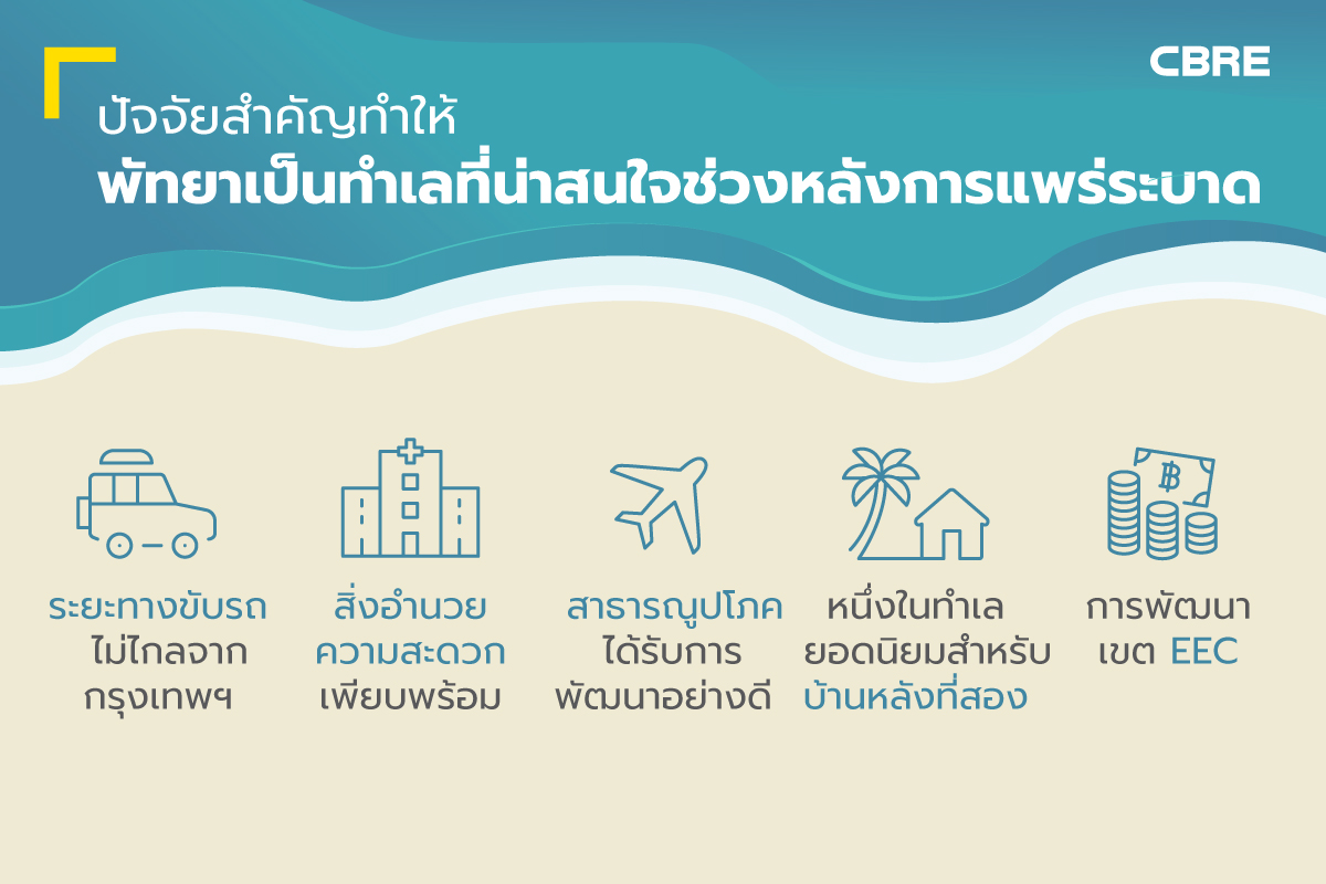 ซีบีอาร์อี บริษัทที่ปรึกษาอสังหาริมทรัพย์ชั้นนำ เผยว่าปัจจัยสำคัญที่ส่งผลให้พัทยามียอดผู้เข้าพักในโรงแรมในระดับสูง คือ ระยะทางขับรถที่ไม่ไกลจากกรุงเทพฯ การมีสิ่งอำนวยความสะดวกที่เพียบพร้อม มีระบบสาธารณูปโภคที่ได้รับการพัฒนาเป็นอย่างดี และการที่ผู้คนยังระมัดระวังในการเดินทางด้วยเครื่องบินแม้สายการบินต่างๆ จะมีมาตรการด้านสุขภาพและความปลอดภัยอย่างจริงจังแล้วก็ตาม