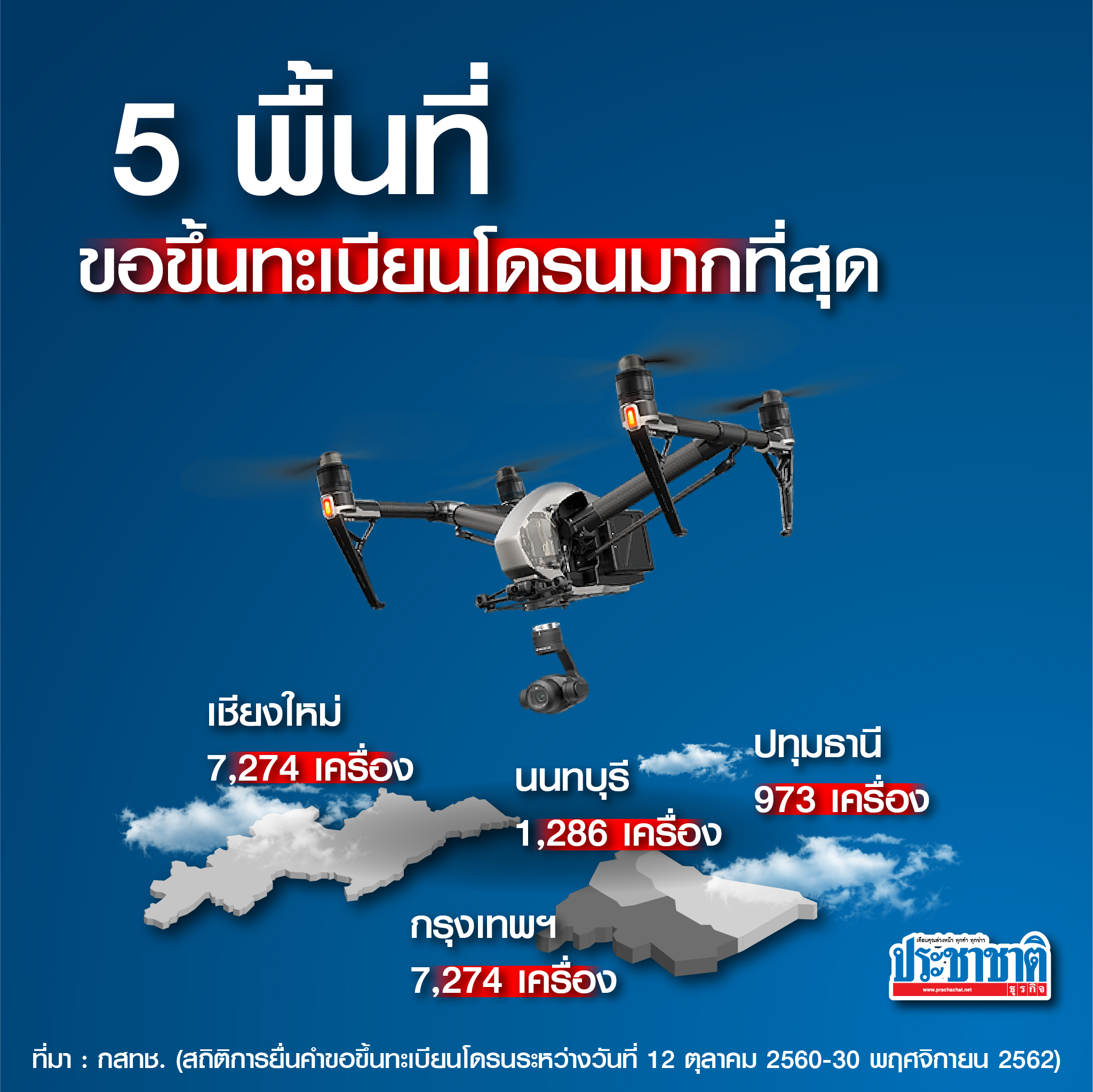 จากข้อมูลจาก กสทช. สถิติการยื่นคำขอขึ้นทะเบียนโดรนระหว่างวันที่ 12 ตุลาคม 2560 – 30 พฤศจิกายน 2562 พบว่า มีผู้ยื่นคำขอขึ้นทะเบียนทั้งสิ้น 17,298 เครื่อง โดยพื้นที่ที่มีผู้ขอขึ้นทะเบียนโดรนมากที่สุด 5 อันดับแรก ได้แก่ กรุงเทพฯ 7,274 เครื่อง นนทบุรี 1,286 เครื่อง เชียงใหม่ 1,052 เครื่อง ปทุมธานี 973 เครื่อง และสมุทรปราการ 739 เครื่อง